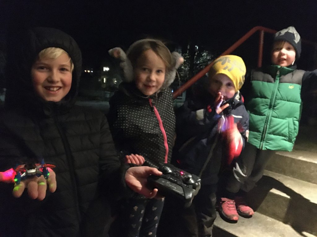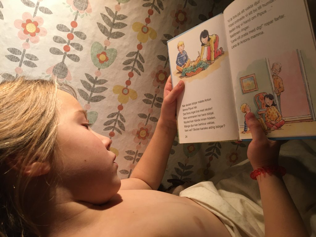 Alla löv är borta och det är grått, grått, grått och regnigt och blåsigt men varmt. Och som grädde på moset så har viruset tagit fart igen och vi uppmanades igår av vår statsminister i ett tal till nationen att bara umgås med den egna familjen så långt det är möjligt. Offentliga samlingar på fler än 8 är förbjudna. Det är lätt att längta till lite snö och is som inbjuder till utelek. Eller ännu hellre till sommar, värme och vaccin och ett post-covid-19 samhälle. Helt i linje med denna gråa tid försöker vi renovera hemma och kör gudstjänster och bokklubb via zoom och har understimulerade och barn som tar ut sin överskottsenergi på varandra ? En ljuspunkt i helgen var ändå minidrönarflygning i mörkret igår kväll. Och så gläds vi över att Signe erövrar läsningens konst.