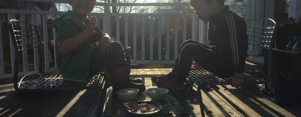 Fredagar är min dag hemma med Amos och Silas. Det brukar vara lugna men intensiva och lite bråkiga dagar. Lite kojbygge, hönshusstädning, biblioteksbesök, snabblunch innan vi ska iväg och hämta storasyskonen. Men nu får vi inte komma in i skola pga något virus utan vi får vänta utanför. Sedan ska vi hem. Silas vill cykla…